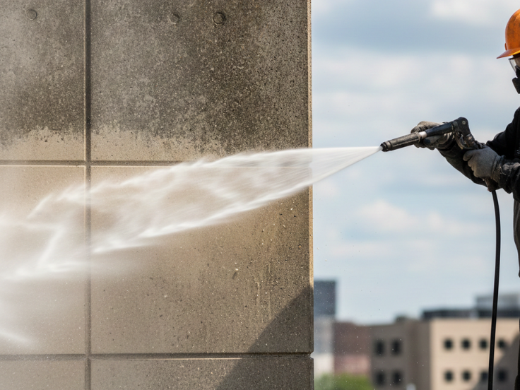 High-pressure water jet cleaning uses controlled water pressure to remove heavy contamination without damaging surfaces. Each site is assessed to determine the appropriate pressure level and cleaning method based on surface type and condition.